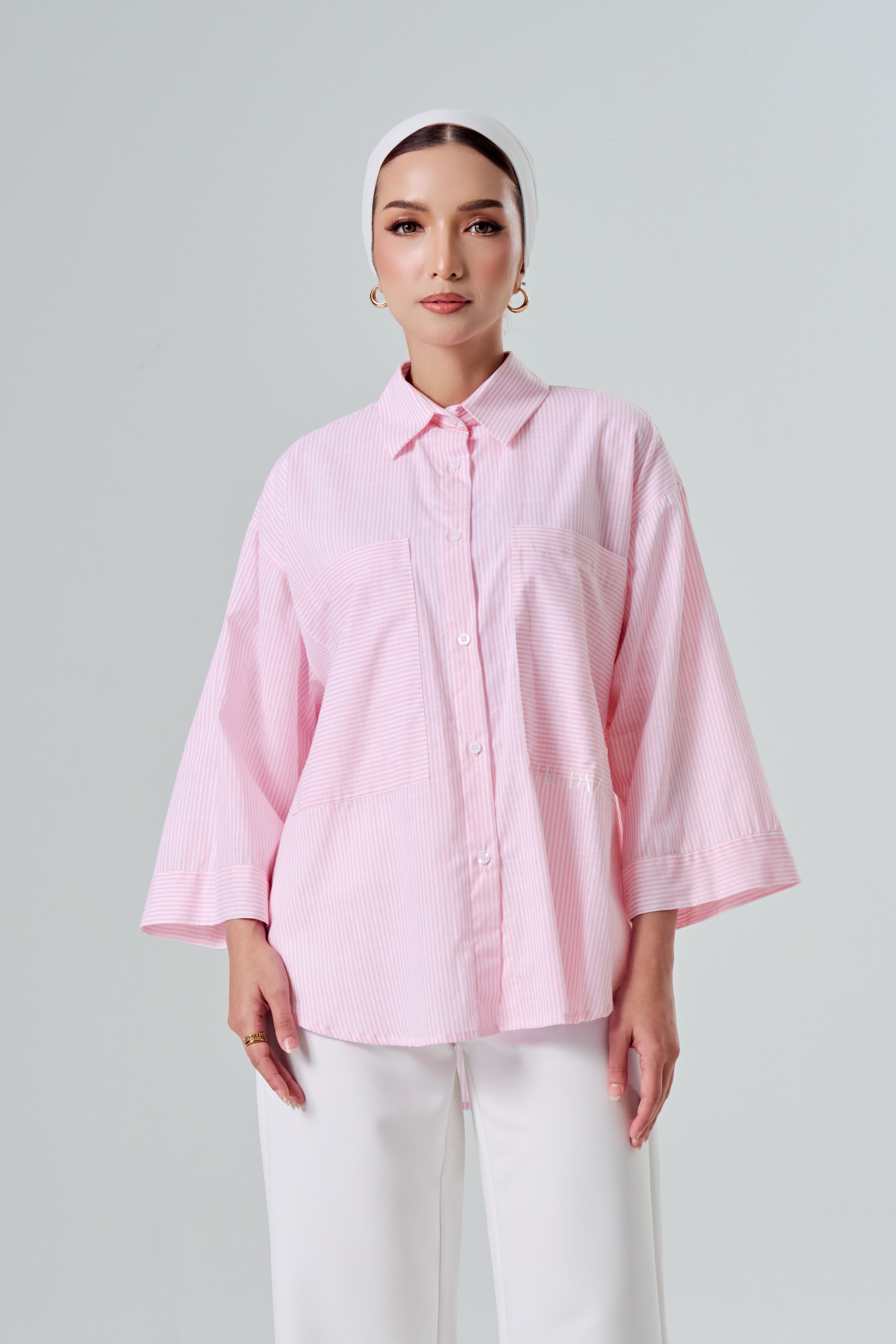 Top: Oversized stripes button-down shirt with dual patch pockets