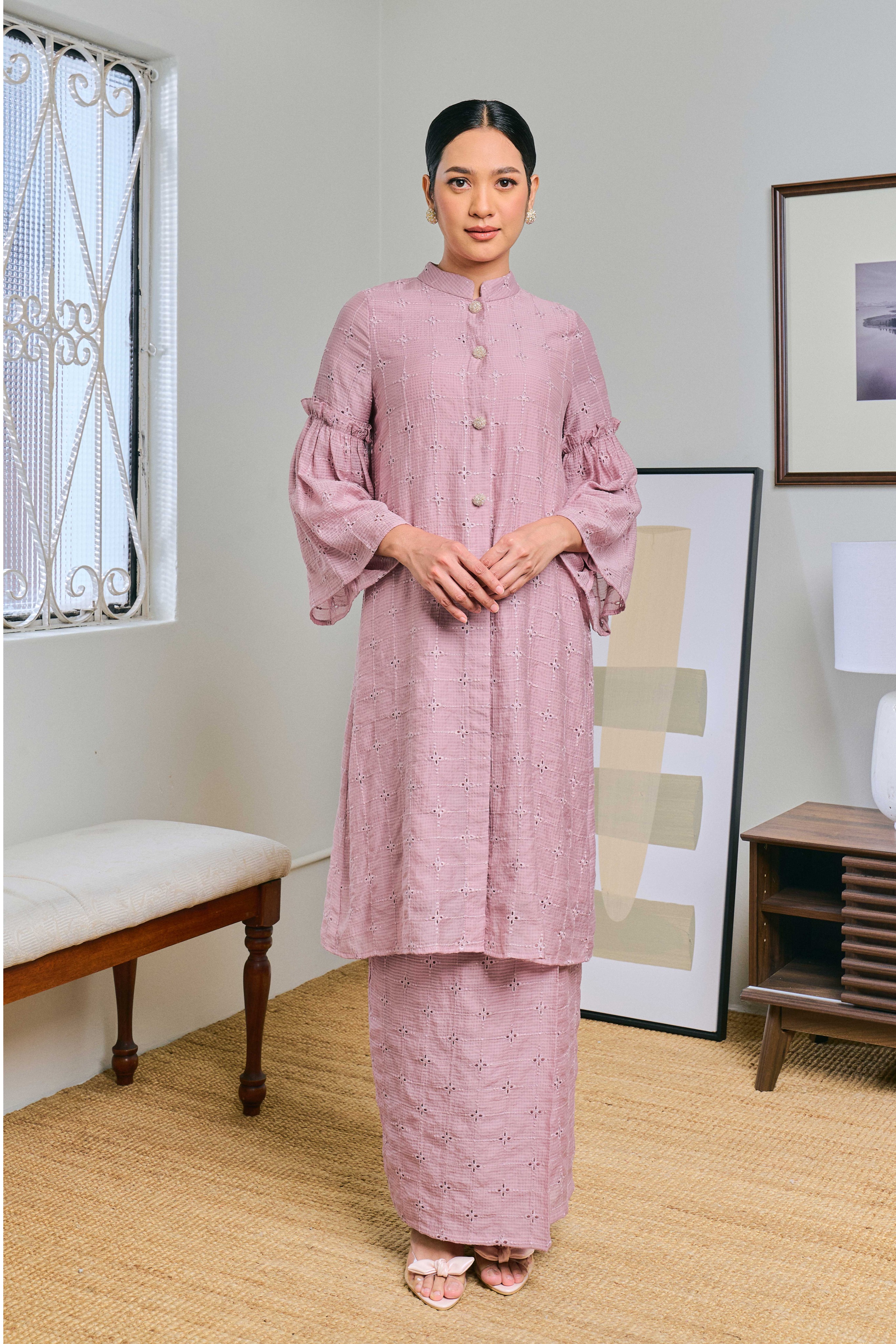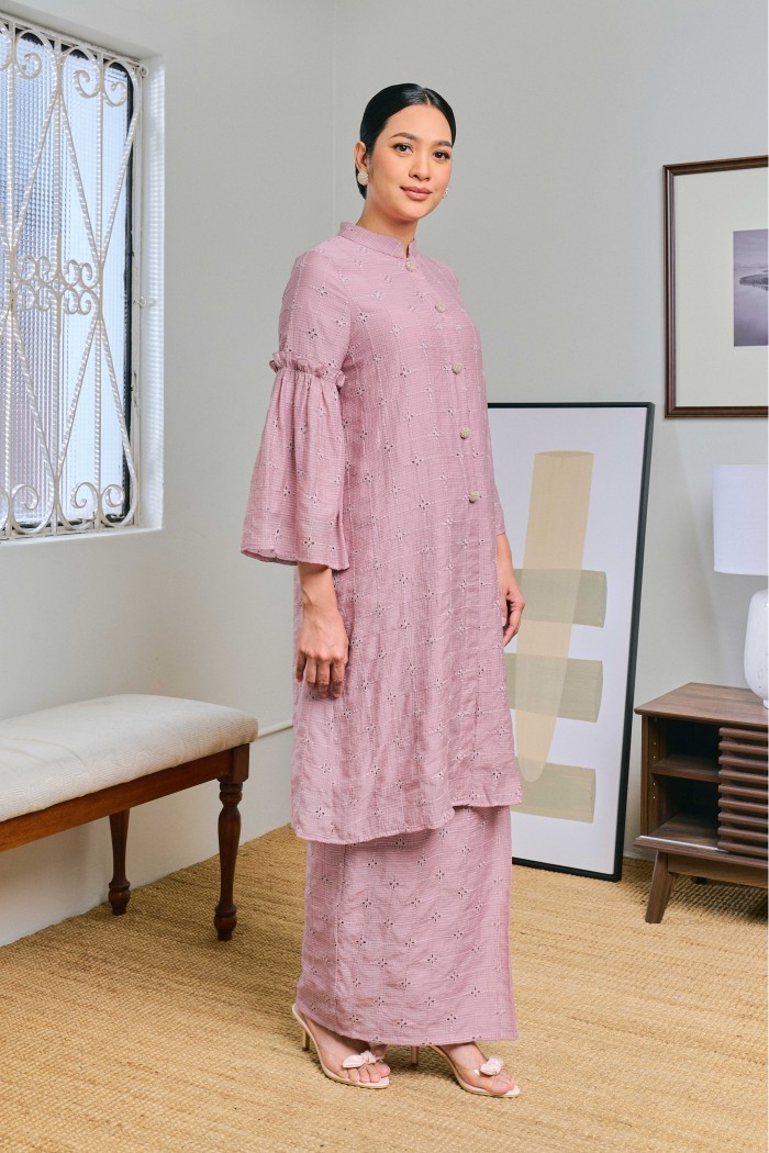 • Kurung Chempaka combines a mandarin collar, delicate embroidery, and a pleated batik skirt for a classic and elegant look.