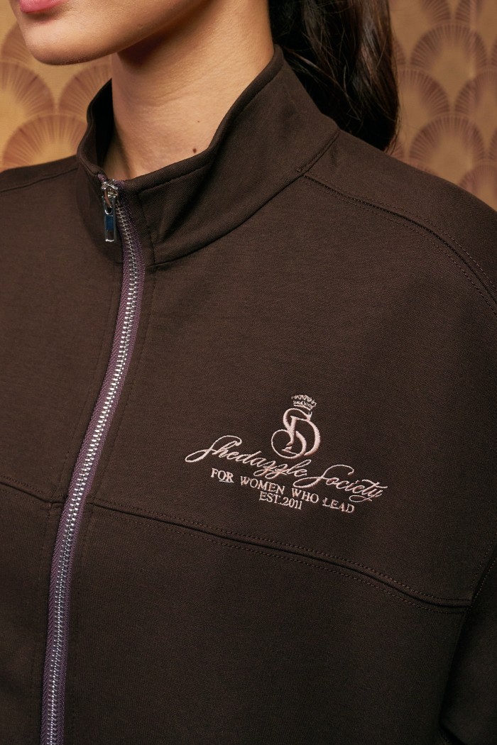 • Two-way reversible zipper jacket with high neck collar and chest embroidery
