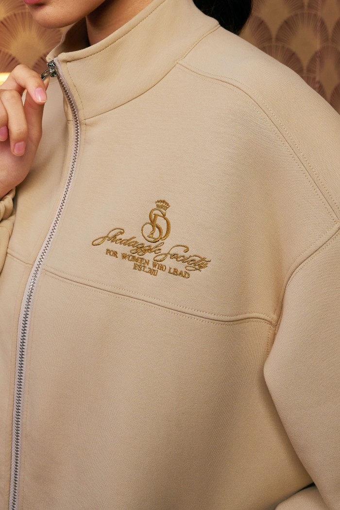 • Two-way reversible zipper jacket with high neck collar and chest embroidery