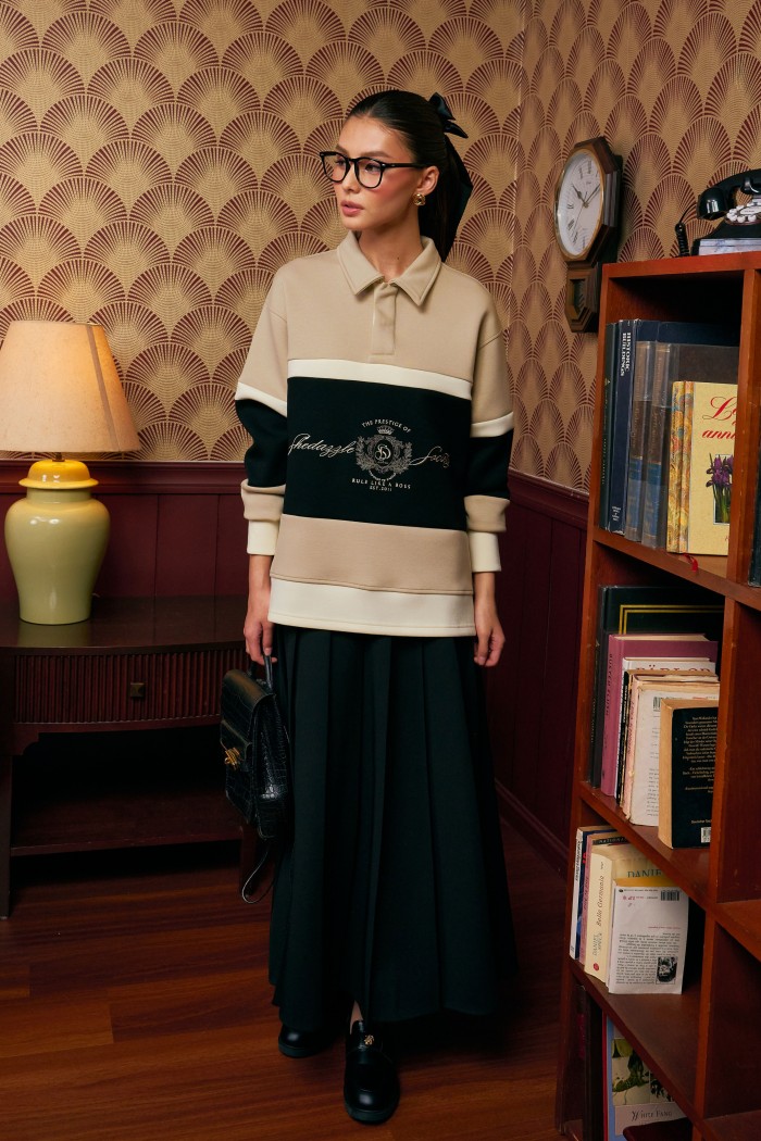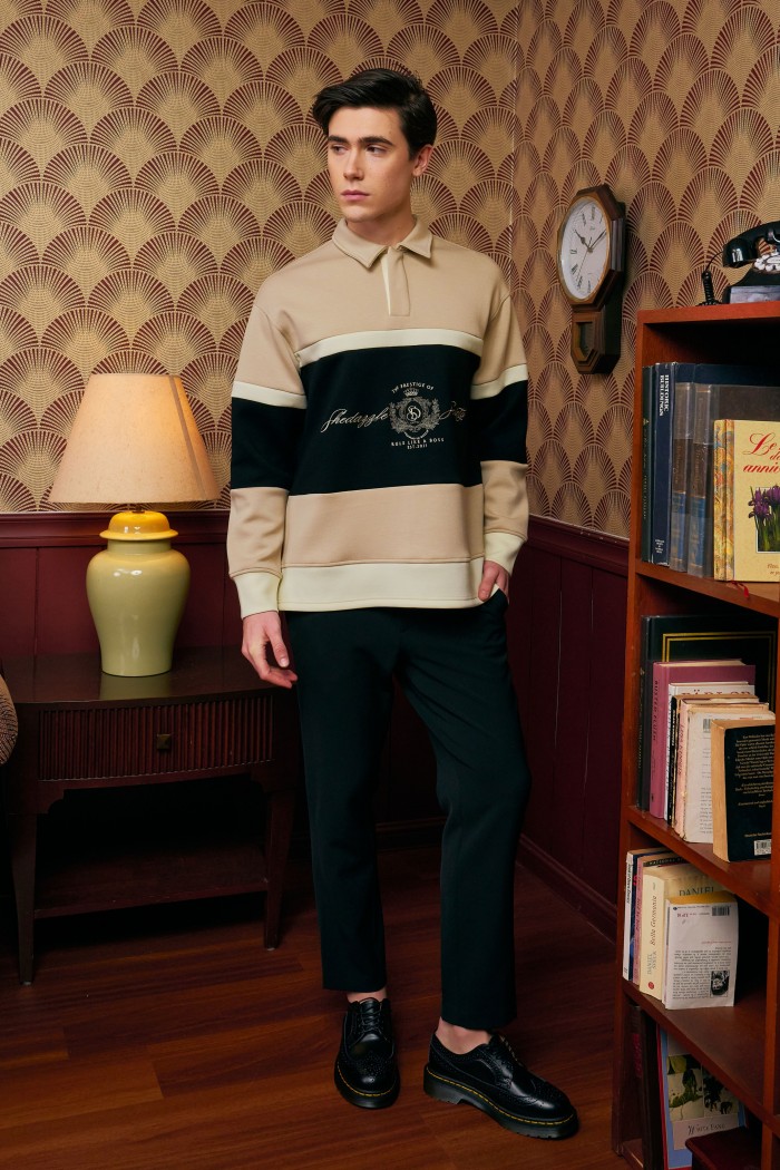 Top: Unisex jumper with triple color block design, concealed placket & logo embroidery
