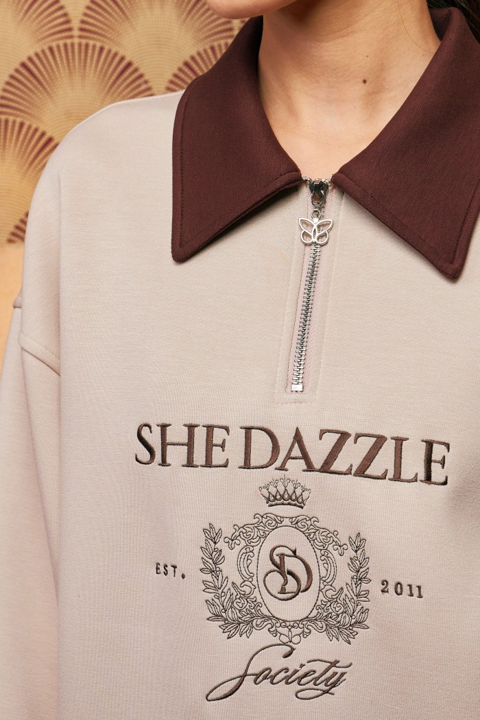 • Oversized sweatshirt cutting with metal half zipper and shirt collar for a stylish edge