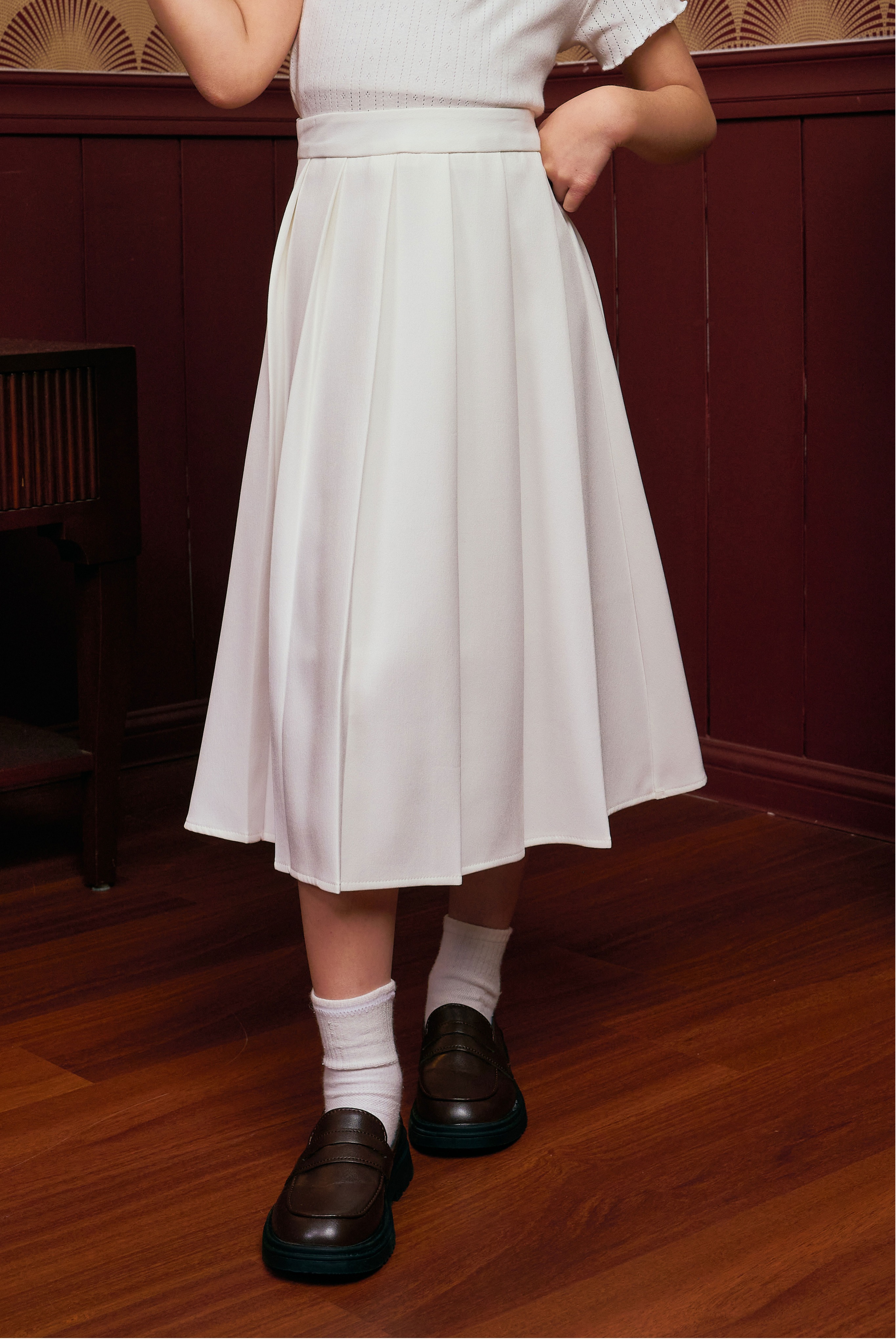 Bottom: Tailored pleated midi skirt with waistband and side zip